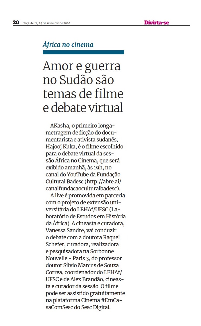 O debate online sobre o filme “AKasha”, promovido pelo Cineclube Fundação Cultural BADESC através da Sessão África no Cinema, foi divulgado na coluna “Divirta-se”, do jornal Notícias do Dia (ND). A nota foi publicada na página 20 da edição de terça-feira, 29 de setembro de 2020. O evento online será no próximo dia 30 de setembro.