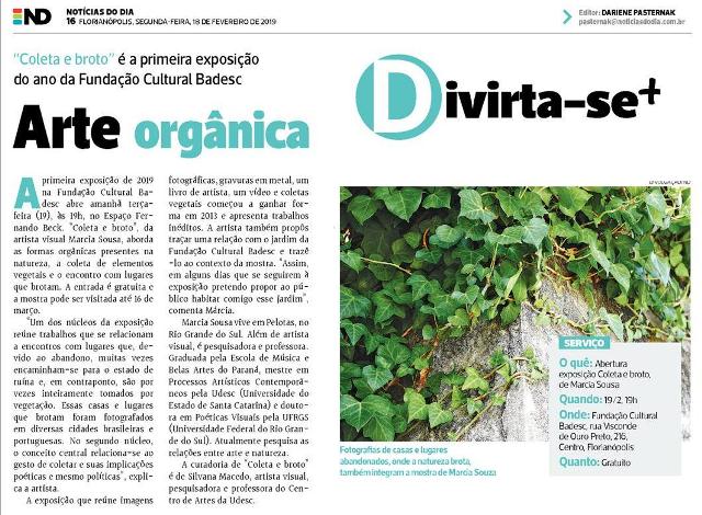 Nesta segunda-feira (18), o jornal Notícias do Dia, divulgou a primeira exposição do ano “Coleta e Broto”, da artista Marcia Sousa. O Abertura ocorre nesta terça-feira, às 19h, na Fundação Cultural Badesc. Entrada franca.