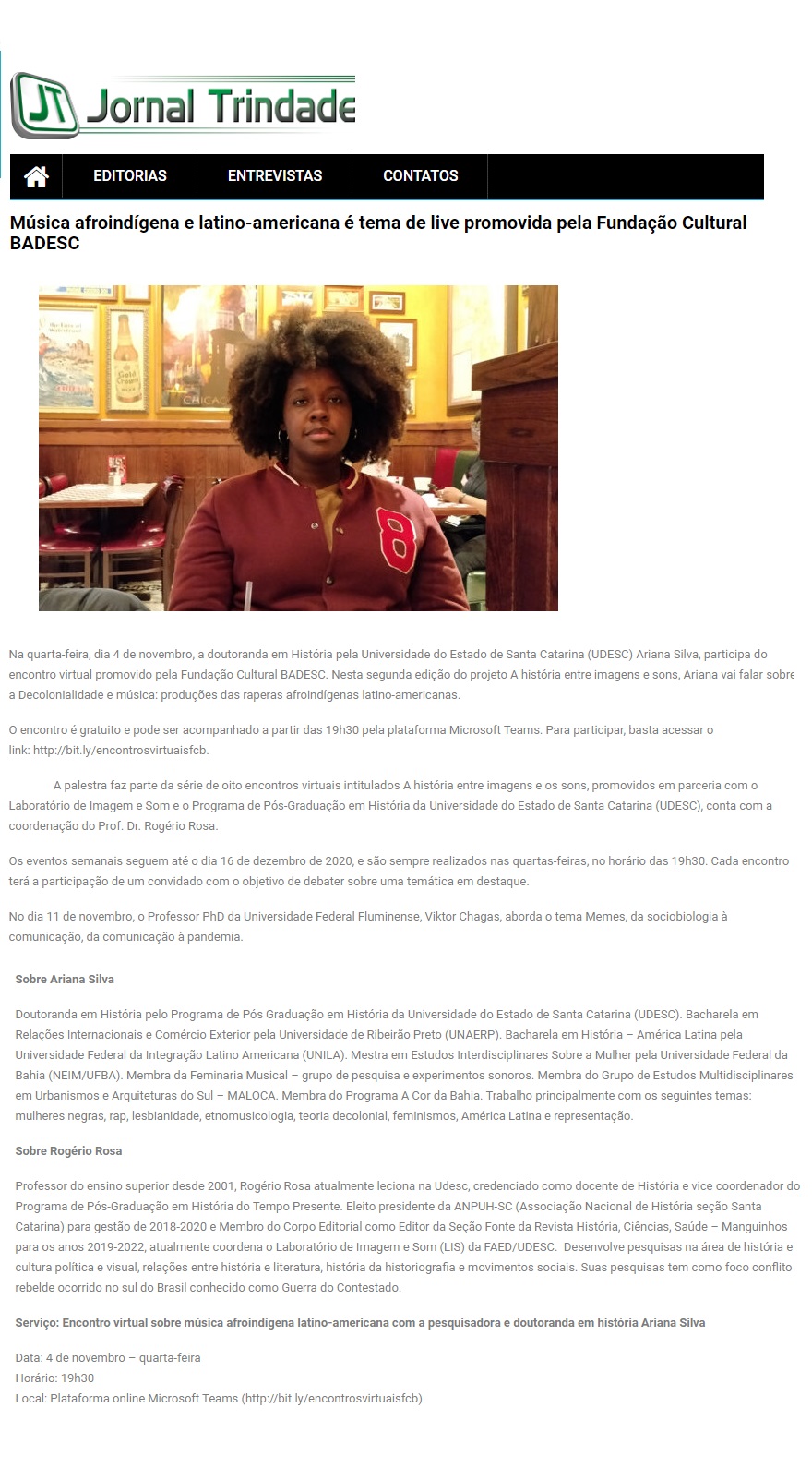 A história entre imagens e sons é uma série de lives promovida pela Fundação Cultural BADESC em parceria com o Laboratório de Imagem e Som e o Programa de Pós-Graduação em História da Universidade do Estado de Santa Catarina (UDESC). O encontro marcado para debater música afroindígena e latino-americana, com mediação de Ariana Silva, foi noticiado pelo Jornal Trindade e a matéria pode ser conferida pelo link: www.jornaltrindade.com.br/musica-afroindigena-e-latino-americana-e-tema-de-live-promovida-pela-fundacao-cultural-badesc/