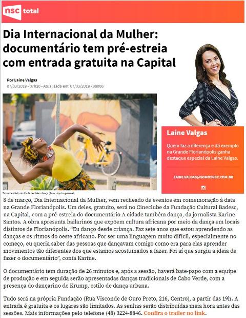 Nesta quinta-feira (7), a jornalista Laine Valgas, divulga no portal NSC Total a pré-estreia do documentário “A Cidade Também Dança”, de Karine Santos. O Cineclube da Fundação Cultural Badesc apresenta amanhã (08/03), às 19h. Entrada gratuita.