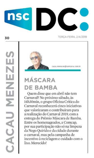 Nesta terça-feira (2), o jornalista Cacau Menezes divulga no Diário Catarinense, uma nota sobre a entrega da premiação Máscara de Bamba. O grupo Oficina Crítica do Carnaval entrega neste sábado (6), às 14h30, na Fundação Cultural Badesc, o prêmio que reconhecerá cinco iniciativas que valorizaram e contribuíram para a realização do Carnaval 2019.Na ocasião também será apresentado o Diagnóstico do Carnaval 2019, documento com dados coletados pelos integrantes do grupo. Entrada gratuita