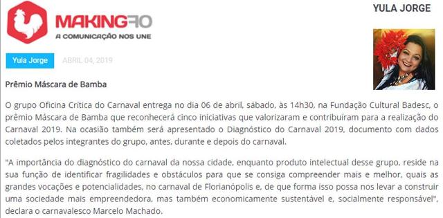 No Portal Making Of, na quinta-feira (4), a colunista Yula Jorge divulgou o evento de entrega do Prêmio Máscara de Bamba. O encontro acontece amanhã, às 14h:30, na Fundação Cultural Badesc. Entrada gratuita.
