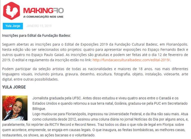 O Portal Making Of, da colunista Yula Jorge, anunciou a abertura do Edital 2019 de exposições, da Fundação Cultural Badesc. O edital e regulamento da inscrição estão no link: https://goo.gl/Z81E7c