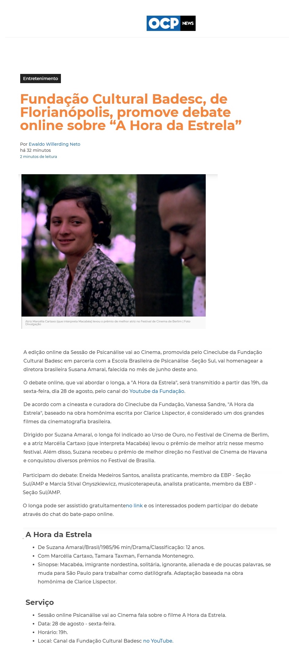A conversa online sobre o filme “A Hora da Estrela”, promovida pelo Cineclube da Fundação Cultural BADESC, para a Sessão Psicanálise vai ao Cinema, foi tema de matéria na editoria de Entretenimento do site OCP News. A publicação foi no último dia 25 de agosto.