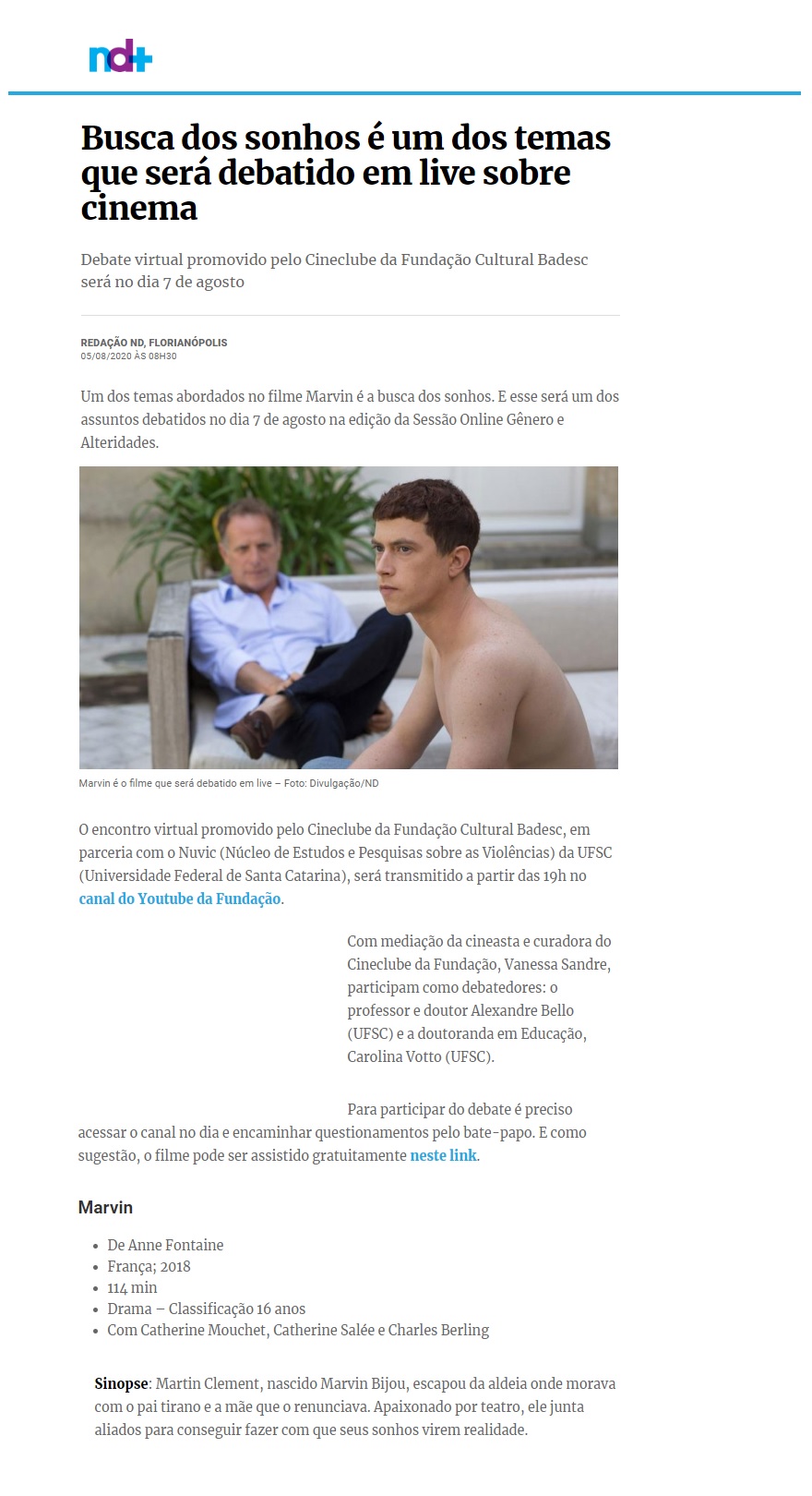 O bate-papo online da Sessão Gênero e Alteridades, da Fundação Cultural BADESC, para debater o longa-metragem “Marvin” foi notícia no portal ND+.