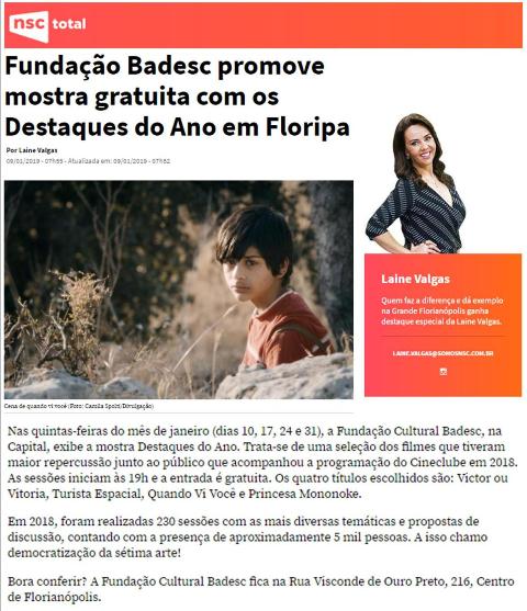 A jornalista Laine Valgas, divulga nesta quarta-feira (9), no portal NSC Total, a mostra Destaques do Ano, que acontecerá às quintas-feiras de janeiro, às 19h, na Fundação Cultural Badesc. A mostra é uma seleção dos filmes que tiveram maior repercussão junto ao público que acompanhou a programação do Cineclube 2018. Entrada gratuita.
