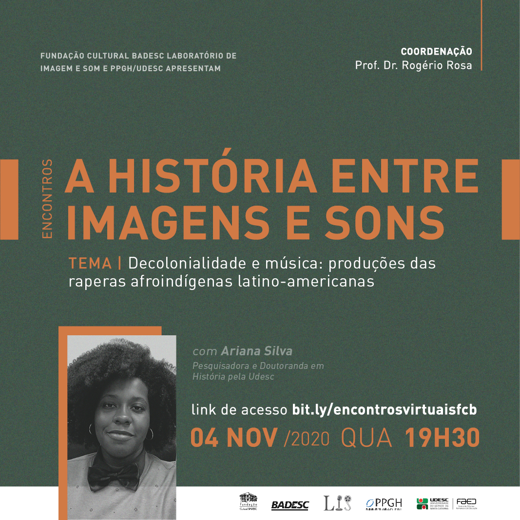 Na quarta-feira, dia 4 de novembro, a doutoranda em História pela Universidade do Estado de Santa Catarina (UDESC) Ariana Silva, participa do encontro virtual promovido pela Fundação Cultural BADESC. Nesta segunda edição do projeto A história entre imagens e sons, Ariana vai falar sobre a Decolonialidade e música: produções das raperas afroindígenas latino-americanas.