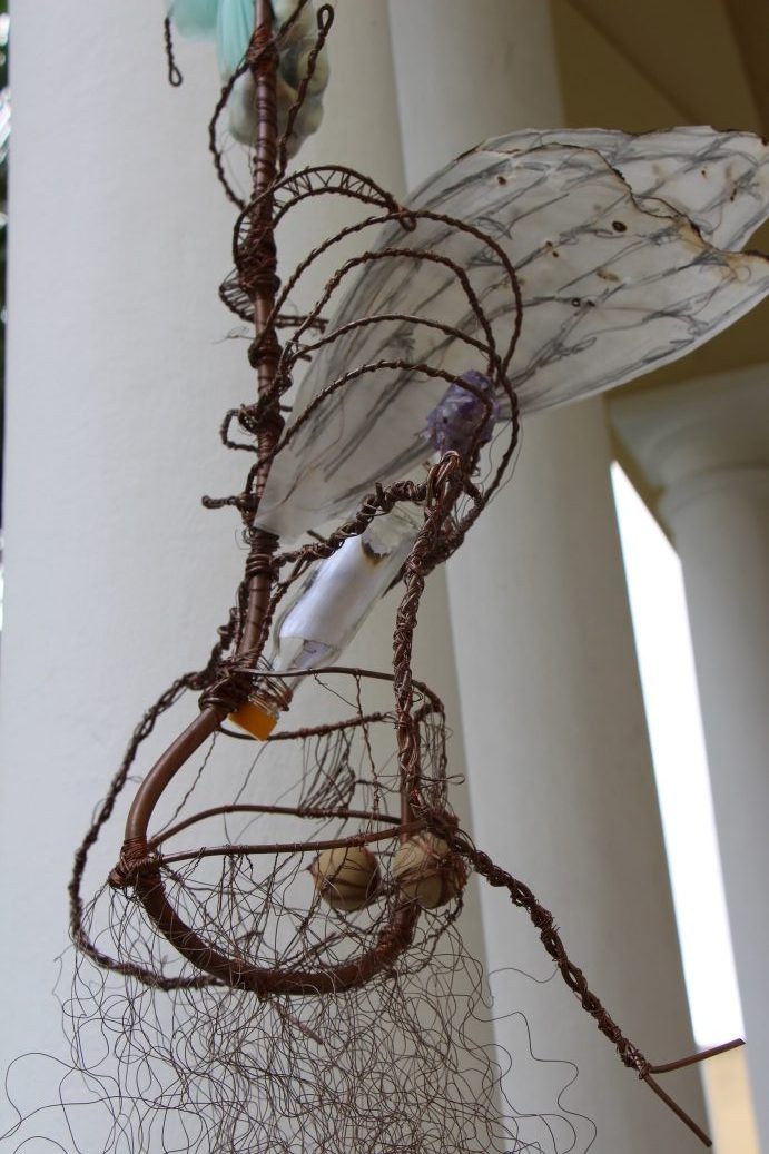 Chalavar, 2013. Trama de metal e poliéster, galhos e sementes de sibipirulina e aro de ferro, 100cm circular e 270cm de altura.