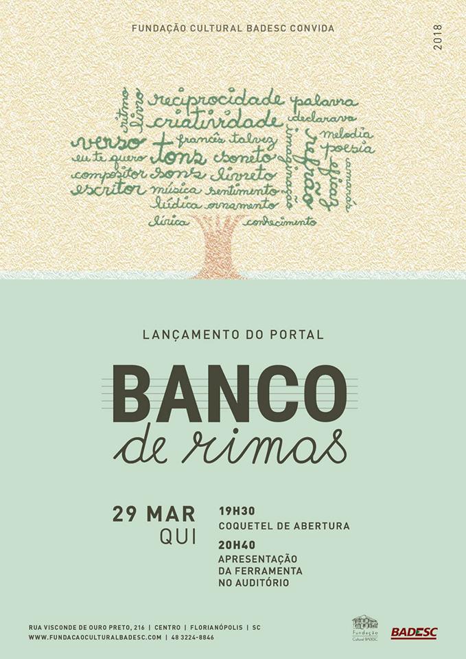 A Fundação Cultural Badesc recebe na quinta-feira (29/03), às 19h30, o lançamento do portal Banco de Rimas, idealizado pela musicista Paula Musique. A ferramenta, acessada pelo site bancoderimas.com, é direcionada para compositores, poetas, escritores, professores e publicitários; mas pode ser desfrutada por todos.