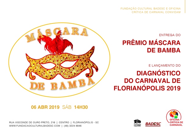 O grupo Oficina Crítica do Carnaval entrega no dia 06 de abril, sábado, às 14h30, na Fundação Cultural Badesc, o prêmio Máscara de Bamba que reconhecerá cinco iniciativas que valorizaram e contribuíram para a realização do Carnaval 2019. Na ocasião também será apresentado o Diagnóstico do Carnaval 2019, documento com dados coletados pelos integrantes do grupo, antes, durante e depois do carnaval.