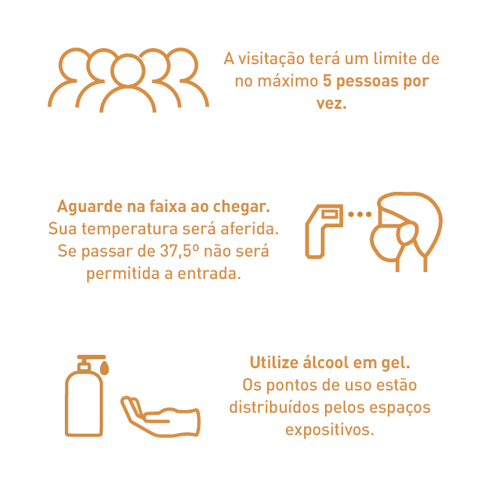 A visitação terá um limite de no máximo 5 pessoas por vez. Aguarde na faixa ao chegar. Sua temperatura será aferida. Utilize álcool em gel.