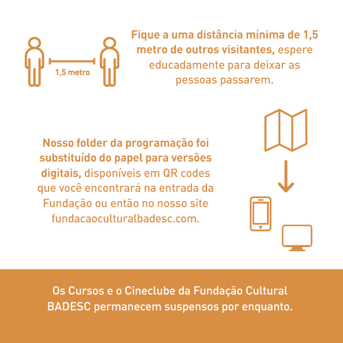 Fique a uma distância segura de outros visitantes. Nosso folder da programação foi substituído para versões digitais. Os Cursos e o Cineclube permanecem suspensos por enquanto.
