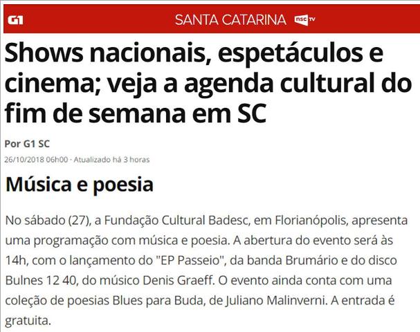 O portal G1 SC (G1 – O Portal de Notícias da Globo) anuncia em nota nesta sexta-feira (26), evento musical que ocorre neste sábado (27), a partir das 14h, na Fundação Cultural Badesc. Entrada gratuita.