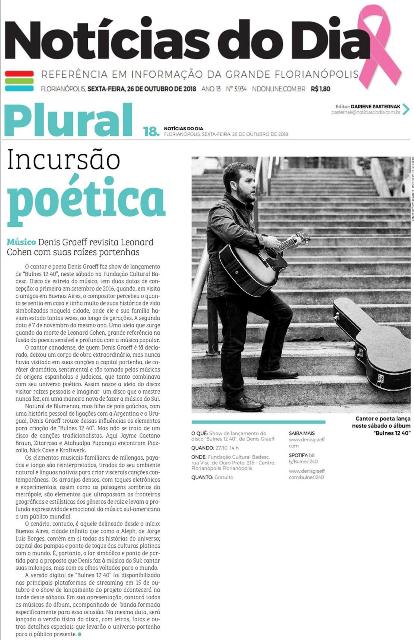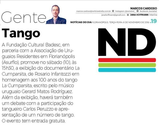 A jornalista Jana Hoffmann, do jornal Notícias do Dia, divulga nesta terça-feira (6), uma nota sobre a exibição do documentário La Cumparsita, de Rosario Infantozzi, em comemoração aos 100 anos do tango. A apresentação acontece neste sábado (10), às 15h30, na Fundação Cultural Badesc. Entrada gratuita.