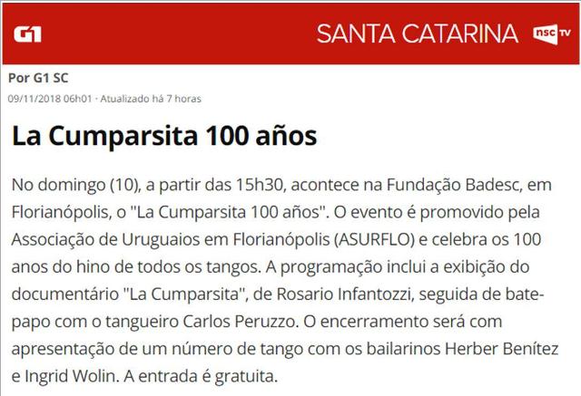 Nesta sexta-feira (9), o portal G1 Santa Catirina divulga evento que acontece neste sábado (10), o encontro marca os 100 anos do tango La Cumparsita, às 15h30, na Fundação Cultural Badesc. Entrada gratuita.