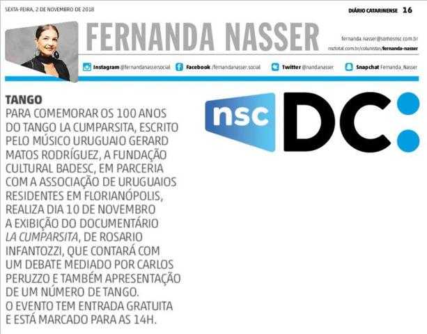 Na sexta-feira (2), a colunista Fernanda Nasser,do Diário Catarinense, publicou uma nota sobre a exibição do documentário La Cumparsita, de Rosario Infantozzi, em comemoração aos 100 anos do tango. A apresentação acontece neste sábado (10), às 15h30, na Fundação Cultural Badesc. Entrada gratuita.