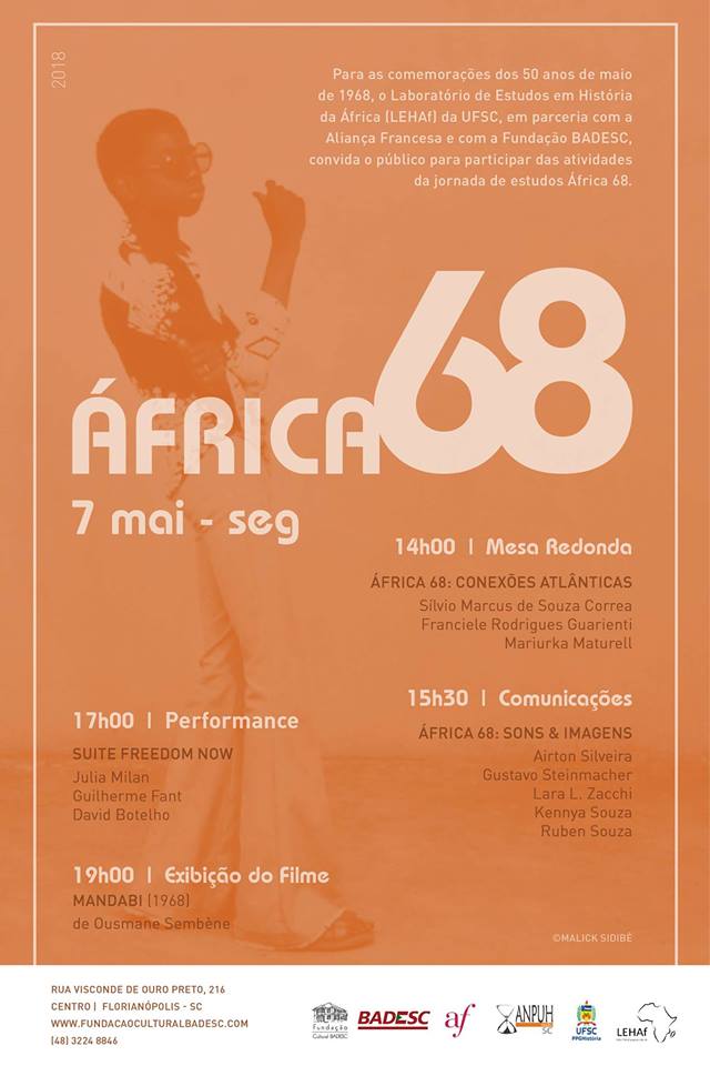 A Fundação Cultural Badesc realiza na segunda-feira (07/05), a partir das 14h, a Jornada de Estudos Africa 68. O evento, promovido pelo Laboratório de Estudos em História da África da Universidade Federal de Santa Catarina (LEHAF/UFSC) em parceria coma a Aliança Francesa, é uma comemoração aos 50 anos do maio de 1968, com foco na África. Este período marcou o auge de um momento de intensas transformações políticas e comportamentais na segunda metade do século 20 no Ocidente.