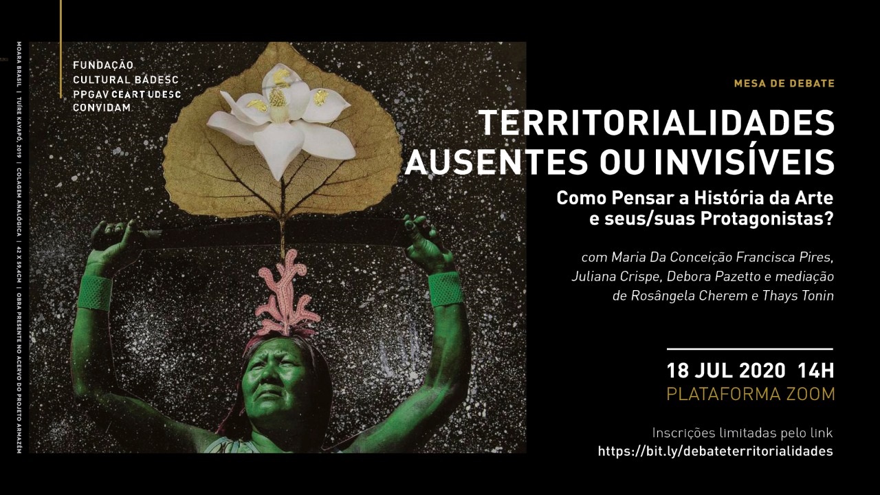 A Fundação Cultural BADESC, em parceria com o Programa de Pós-Graduação em Artes Visuais da UDESC, promove no sábado, dia 18 de julho, uma mesa de debate sobre Territorialidades Ausentes ou Invisíveis, Como Pensar a História da Arte e seus/suas Protagonistas? As inscrições são limitadas e precisam ser feitas pelo formulário online (clique aqui). A transmissão começa às 14h pela plataforma Zoom.