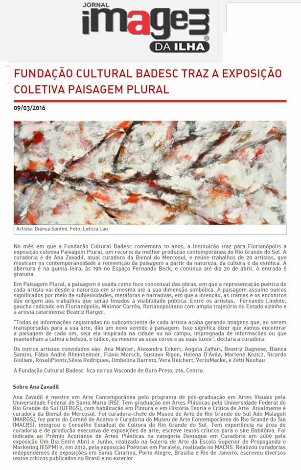 Nesta sexta-feira, 1ª de abril, a atual curadora da Bienal Mercosul, Ana Zavadil, ministrará o workshop sobre curadoria contemporânea na Fundação Cultural Badesc. O curso tem como objetivo apresentar os conceitos que envolvem a curadoria contemporânea em suas mais diversas realidades. Faz-se necessário o estudo de seu enquadramento histórico, a sua prática no contexto das exposições na contemporaneidade e estudos de caso para a construção de uma visão analítica e crítica sobre a sua prática no circuito cultural. Aborda ainda a sua relação direta com a museografia, a expografia e a comunicação. O Workshop é gratuito e ocorre das das 10 às 12h e das 14 às 17h.. Inscrições através do e-mail:fundacaoculturalbadesc@gmail.