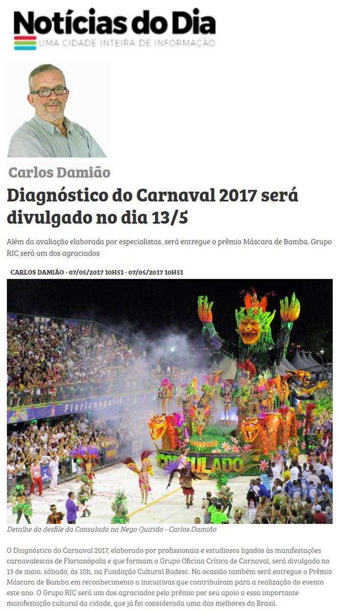 O jornalista Cacau Menezes, do jornal Diário Catarinense, divulga em sua coluna o evento do grupo Oficina Crítica do Carnaval, que apresentará no dia 13 de maio, sábado, às 10h, na Fundação Cultural Badesc, o Diagnóstico do Carnaval 2017, documento que reúne dados coletados durante o desfile das escolas de samba deste ano. Na ocasião também será entregue o Prêmio Máscara de Bamba. O evento é gratuito.
