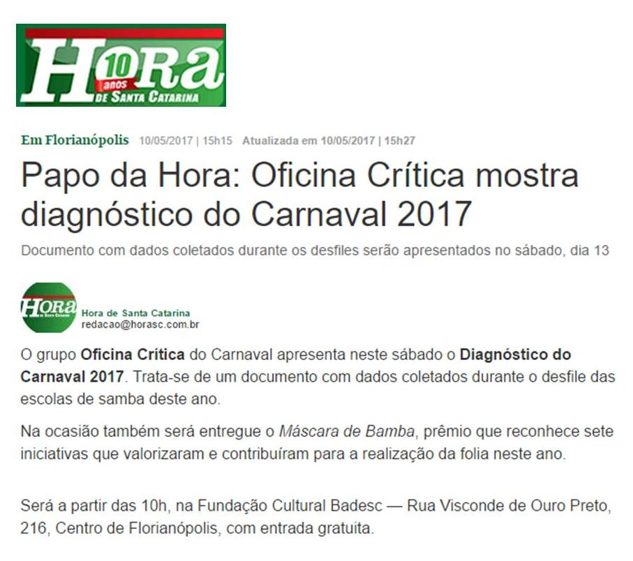 O site do jornal Hora de Santa Catarina divulga o evento do grupo Oficina Crítica do Carnaval, que apresentará no dia 13 de maio, sábado, às 10h, na Fundação Cultural Badesc, o Diagnóstico do Carnaval 2017, documento que reúne dados coletados durante o desfile das escolas de samba deste ano. Na ocasião também será entregue o Prêmio Máscara de Bamba. O evento é gratuito.