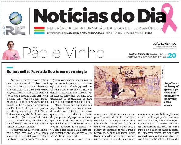 A parceria do músico Rohmanelli com a banda de rock Farra do Bowie, iniciada em 2016, rendeu um novo single que ganhou clipe e será lançado na Fundação Cultural Badesc, em Florianópolis. A apresentação do videoclipe da música Como você me Quer?, será no sábado, 6 de outubro, a partir das 16h30. A entrada é gratuita e conta ainda com um bate-papo com os músicos e pocket show.