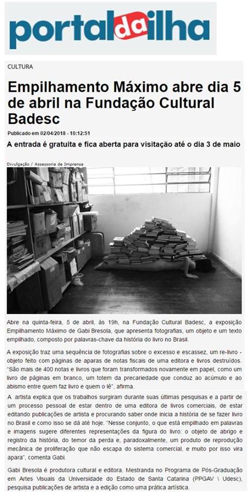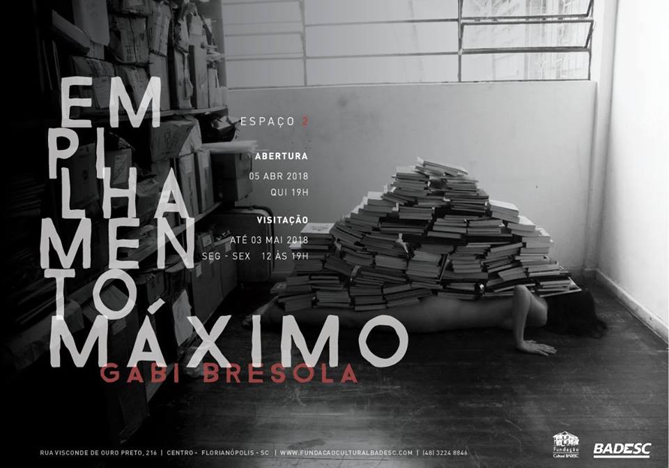 Abre na quinta-feira, 5 de abril, às 19h, na Fundação Cultural Badesc, a exposição Empilhamento Máximo de Gabi Bresola, que apresenta fotografias, um objeto e um texto empilhado, composto por palavras-chave da história do livro no Brasil. A entrada é gratuita e fica aberta para visitação até o dia 3 de maio.