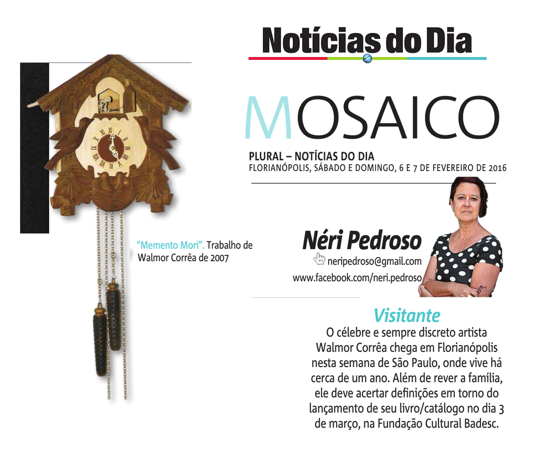 Jornalista Neri Pedroso, em sua coluna no Jornal Notícias do Dia, abre espaço para falar sobre a obra do artista Walmor Corrêa, que pode ser conferida no Espaço 3 da Fundação Cultural Badesc.