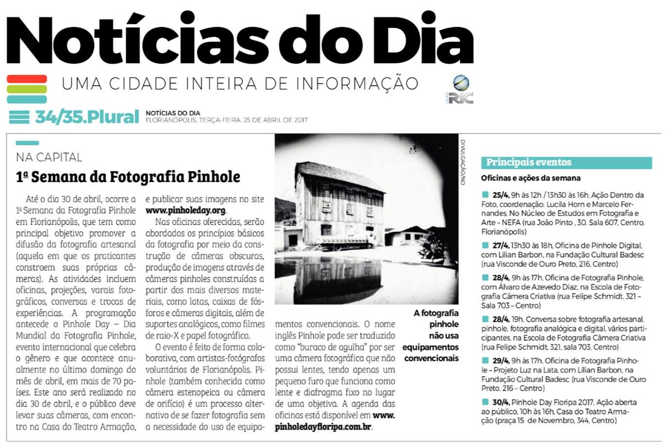 A jornalista Néri Pedroso divulga, em sua coluna Mosaico, do jornal Notícias do Dia, nota sobre as duas oficinas ministradas pela fotógrafa e artista visual Lilian Barbon confirmadas para quinta-feira (27/04) e sábado (29/04), na Fundação Cultural Badesc. As inscrições devem ser realizadas pelo sitewww.pinholedayfloripa.com.br. As oficinas são gratuitas.