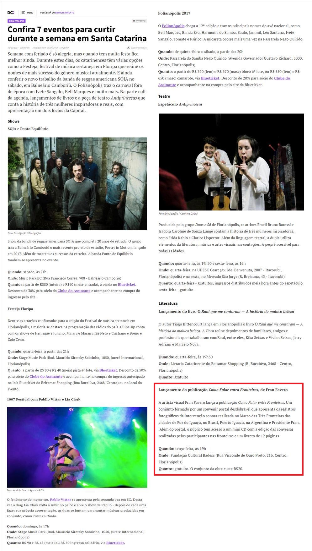 O caderno Anexo, do jornal Diário Catarinense, divulga nota sobre o lançamento da publicação de artista Como Falar entre Fronteiras, de Fran Favero. O trabalho foi desenvolvido a partir de uma intervenção sonora no Marco das Três Fronteiras das cidades de Foz do Iguaçu, no Brasil, Puerto Iguazu, na Argentina e Presidente Franco, no Paraguai. O lançamento será amanhã (31/10), às 19h, na Fundação Cultural Badesc.