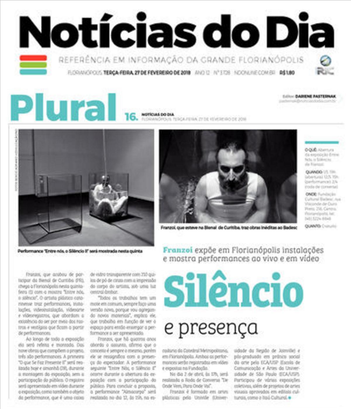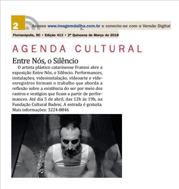 O artista plástico catarinense Franzoi abre na quinta-feira, 1º de março, às 19h, no Espaço Fernando Beck, na Fundação Cultural Badesc, a exposição “entre nós, o silêncio”. Performances, instalações, videoinstalação, vídeoarte e vídeosregistros formam o trabalho que aborda a reflexão sobre a existência do ser por meio dos rastros e vestígios que ficam a partir de performances.
