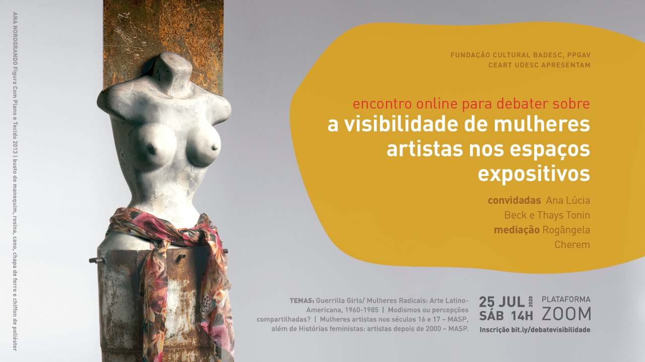 A Fundação Cultural BADESC, em parceria com o Programa de Pós-Graduação em Artes Visuais da UDESC, promove no sábado, 25 de julho, um encontro online para debater sobre a visibilidade de mulheres artistas nos espaços expositivos. As inscrições são limitadas e precisam ser feitas pelo formulário online (clique aqui) . A transmissão pela plataforma Zoom, começa às 14h.