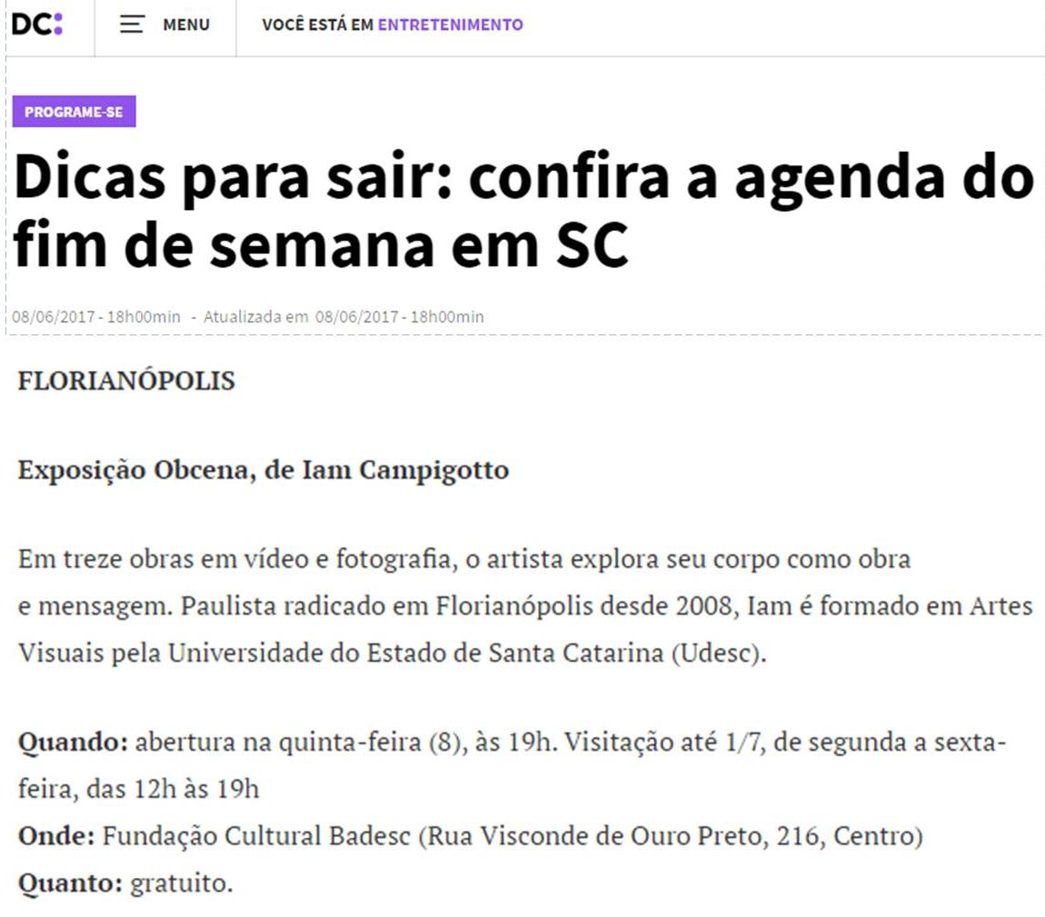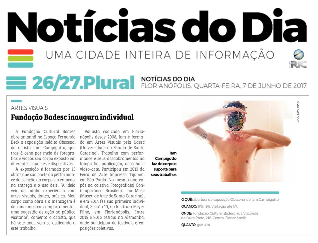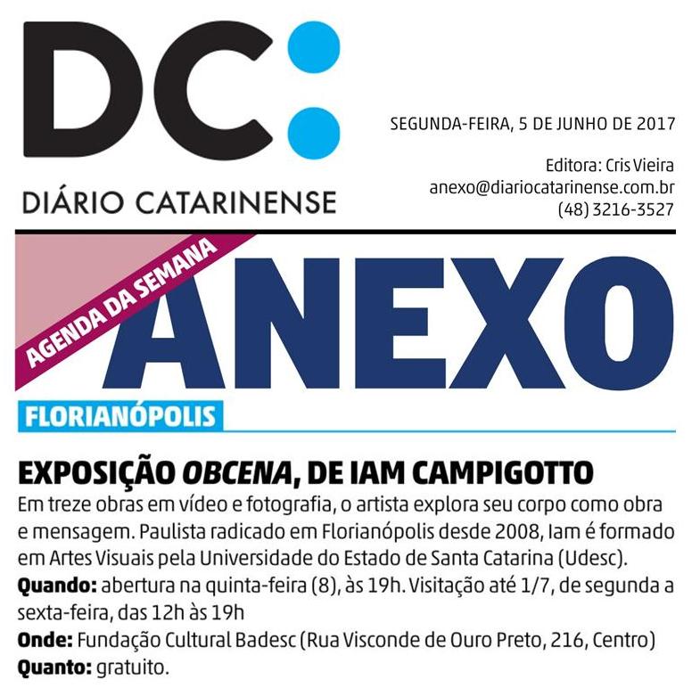 A Fundação Cultural Badesc abre no dia 8 de junho, às 19h, no Espaço Fernando Beck, a exposição inédita Obscena, de Iam Campigotto, que traz à cena por meio de fotografias e vídeos seu corpo exposto em diferentes suportes e dispositivos.