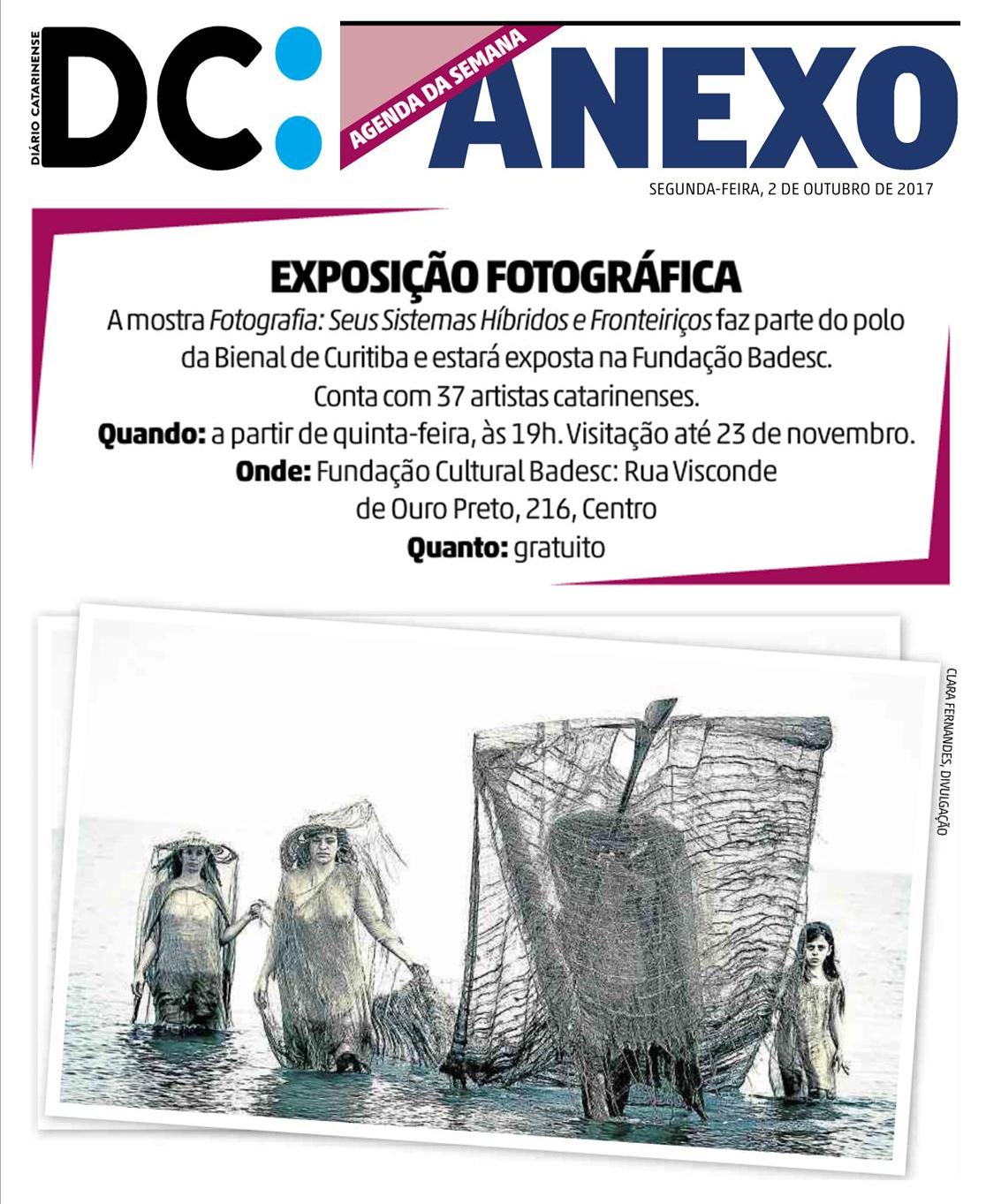 A capa do caderno Anexo, do jornal Diário Catarinense, destaca a Bienal Internacional de Curitiba, um dos grandes eventos de arte contemporânea da América do Sul e do circuito mundial. Nesta edição, em parceria inédita, a Fundação Cultural Badesc apoia a Bienal abrigando a partir de 5 de outubro, às 19h, no Espaço Fernando Beck, a exposição Fotografia: seus sistemas híbridos e fronteiriços com obras fotográficas de 37 artistas. A entrada é gratuita.