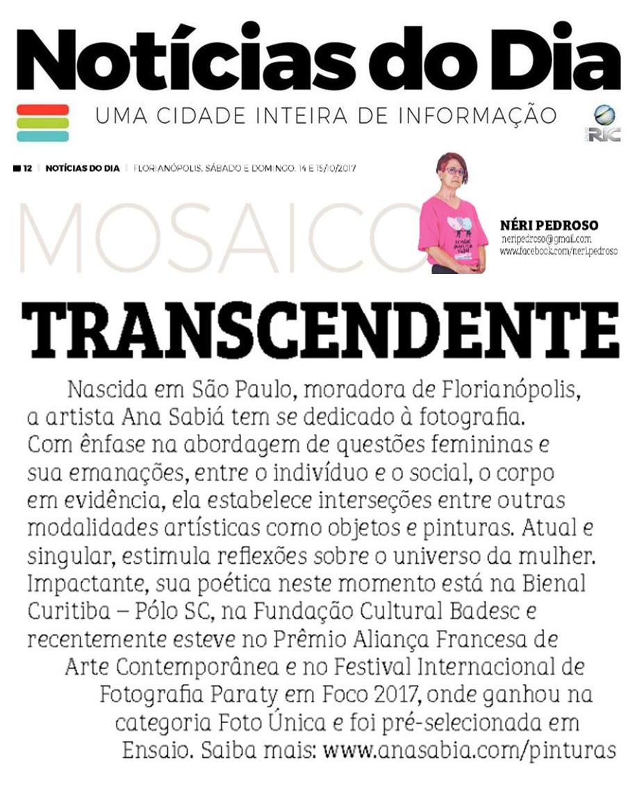 A jornalista Néri Pedroso, do jornal Notícias do Dia, divulga nota na coluna MOSAICO sobre Ana Sabiá, artista que participa da Bienal Internacional de Curitiba Polo SC com obras que estimulam reflexões sobre o universo da mulher. A exposição na Fundação fica aberta para visitação até o dia 23 de novembro, de segunda a sexta-feira, das 12 às 19h. A entrada é gratuita.