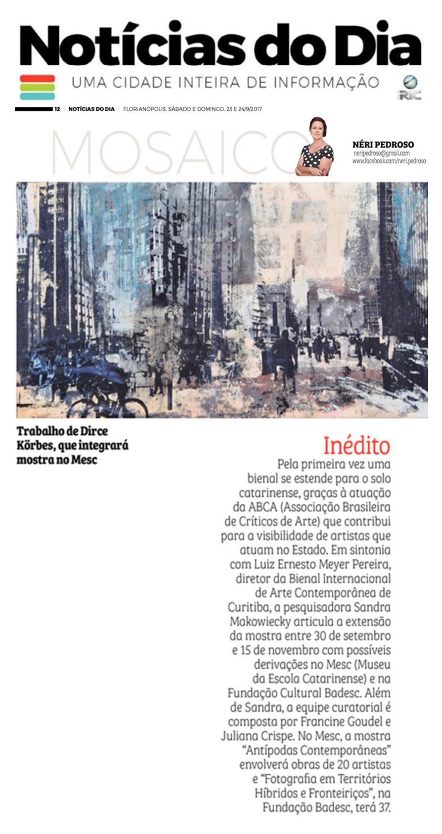 A jornalista Neri Pedroso, destaca na coluna Mosaico, do jornal Notícias do Dia, a realização pela primeira vez em Santa Catarina da Bienal. A Fundação Cultural Badesc sediará a mostra “Fotografia em Territórios Híbridos e Fronteiriços”, com a participação de 37 artistas.