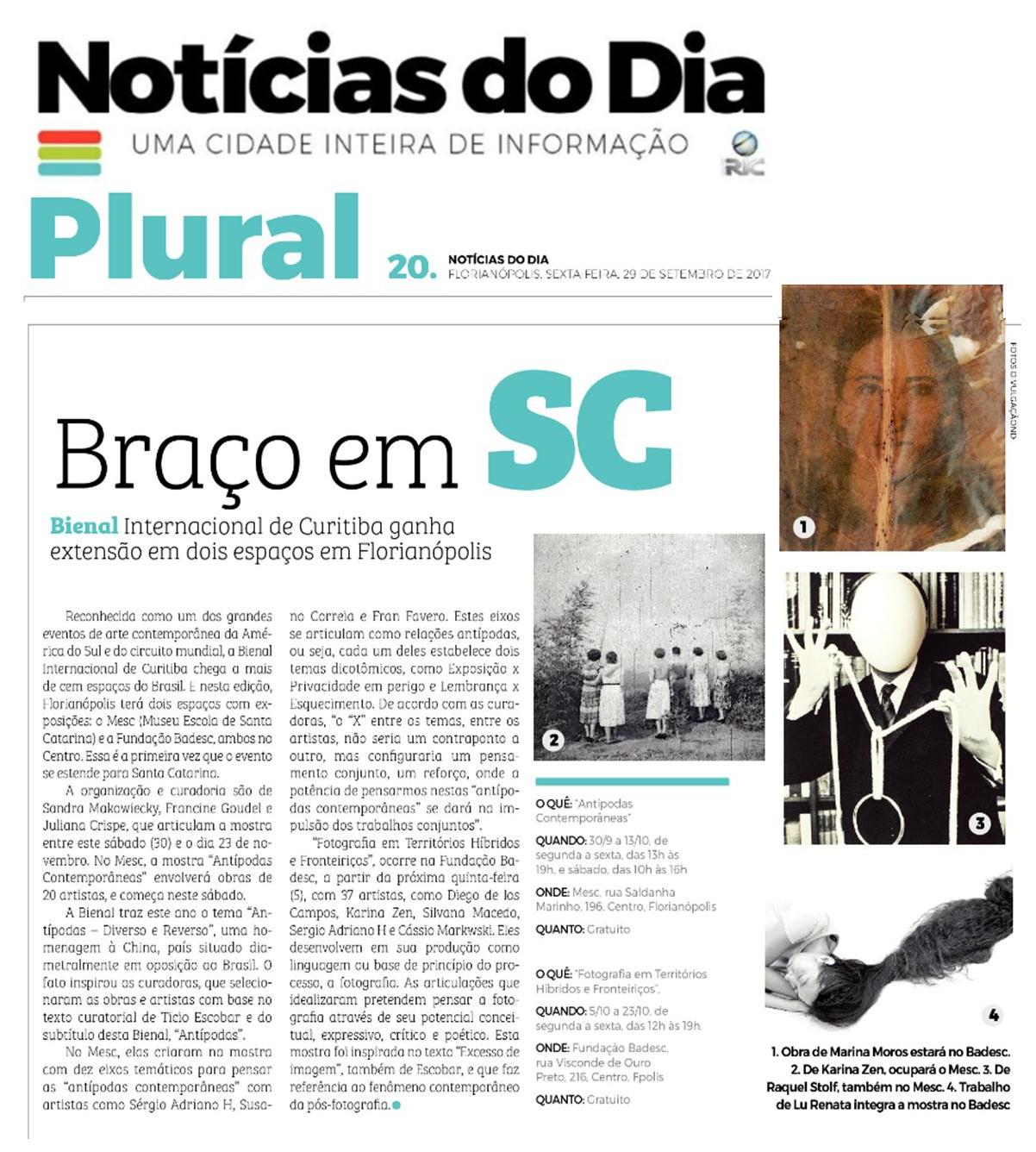 O caderno Plural, do jornal Notícias do Dia, destaca a Bienal Internacional de Curitiba, um dos grandes eventos de arte contemporânea da América do Sul e do circuito mundial. Nesta edição, em parceria inédita, a Fundação Cultural Badesc apoia a Bienal abrigando a partir de 5 de outubro, às 19h, no Espaço Fernando Beck, a exposição Fotografia: seus sistemas híbridos e fronteiriços com obras fotográficas de 37 artistas. Entre os artistas selecionados nomes com repercussão nacional como Clara Fernandes, Carlos Franzoi, Fabíola Scaranto, Yara Guasque, Claudia Zimmer, Rosana Bortolin e Sandra Favero. A entrada é gratuita.