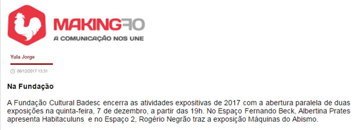 A exposição Máquinas do Abismo, do designer e artista visual Rogério Negrão, está prorrogada até o dia 9 de fevereiro, no Espaço 2 da Fundação Cultural Badesc. Com curadoria de Franzoi, a mostra multimídia é formada por colagens digitais impressas, vídeo arte, instalações sonoras e objetos. O trabalho é estruturado em uma pesquisa que começou em 2015 e tem origem na experiência profissional ligada ao design de produtos.