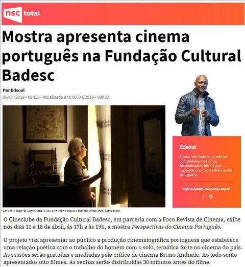 O Cineclube da Fundação Cultural Badesc, em parceria com a Foco Revista de Cinema, exibe nos dias 11 e 18 de abril, às 17h e 19h, a Mostra Perspectivas do Cinema Português. O projeto visa apresentar ao público a produção cinematográfica portuguesa que estabelece uma relação poética com o trabalho do homem com o solo, temática forte no cinema do país. As sessões serão mediadas pelo crítico de cinema, Bruno Andrade.