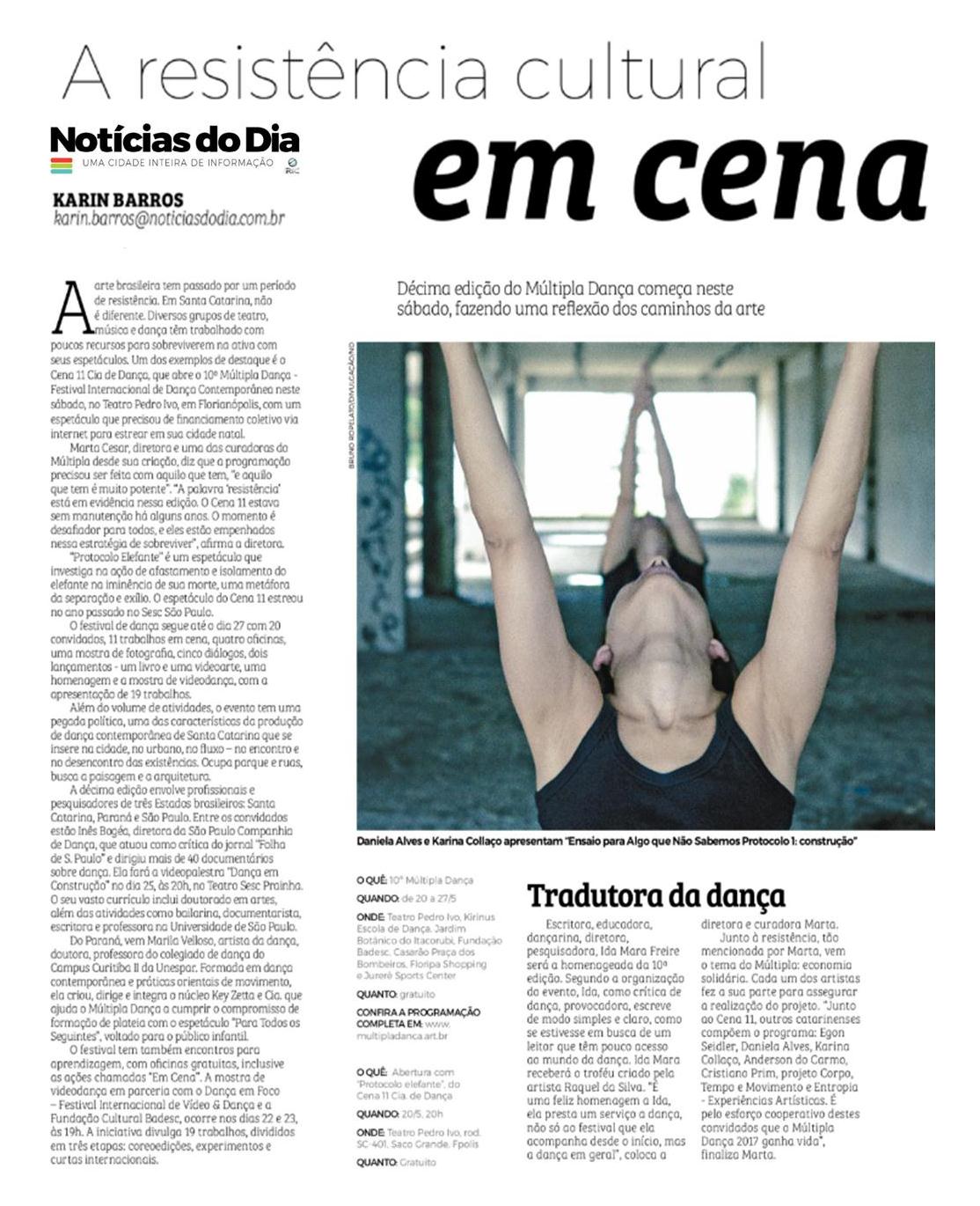 A jornalista Karin Barros, do jornal Notícias do Dia, divulga a décima edição do Múltipla Dança. A programação inclui atividades na Fundação Cultural Badesc, como mostra de vídeodança, performance, homenagem e lançamento de livro, nos dias 22, 23 e 24 de maio. Todas as atividades são gratuitas.