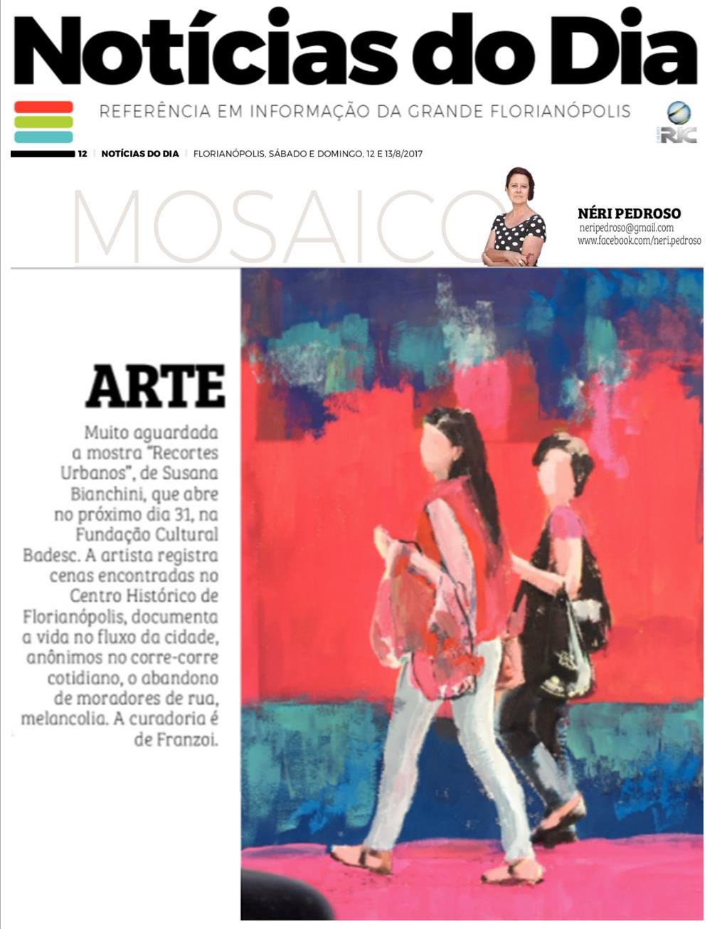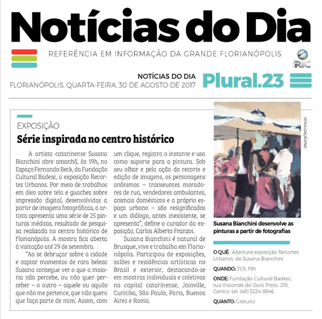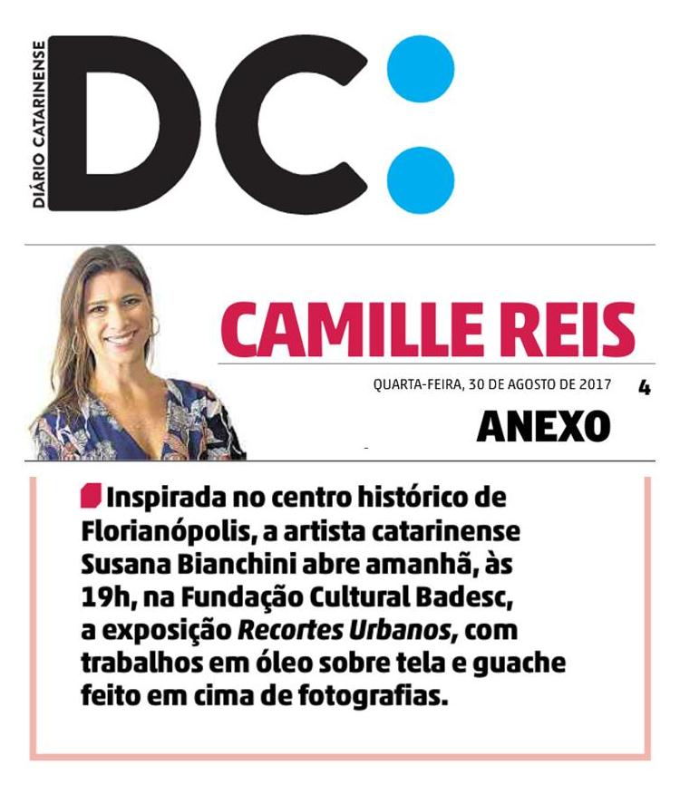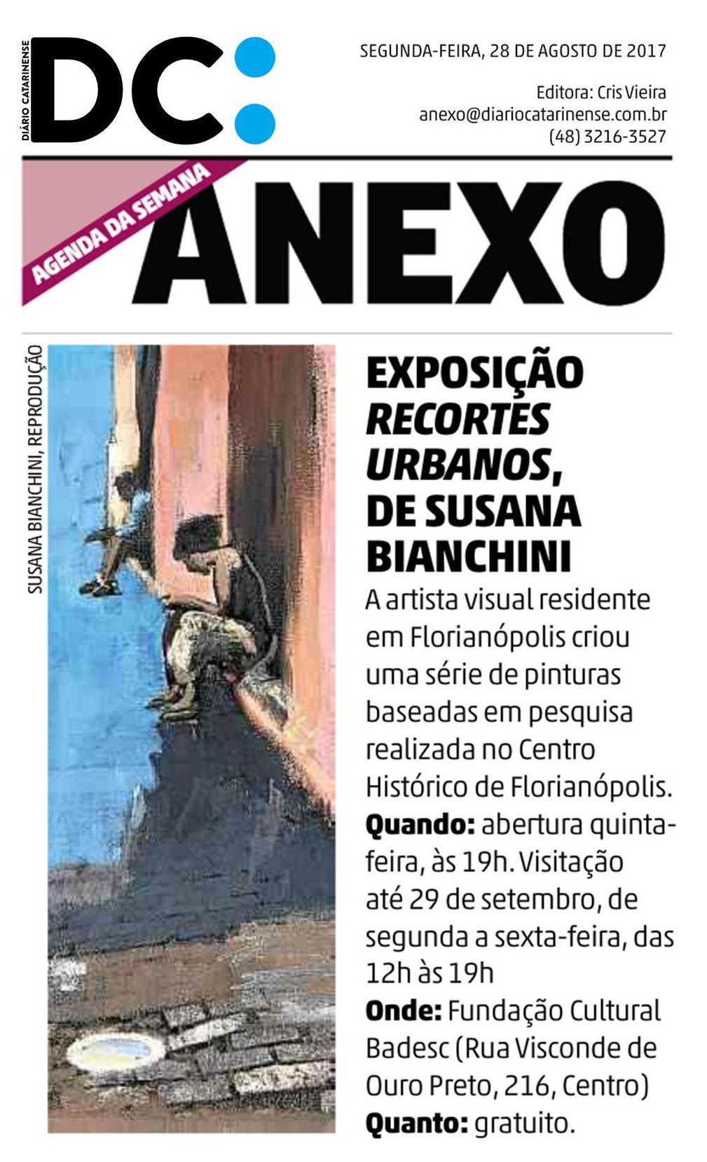 A artista catarinense Susana Bianchini abre na quinta-feira (31/08), às 19h, no Espaço Fernando Beck, da Fundação Cultural Badesc, a exposição Recortes Urbanos. Por meio de trabalhos em óleo sobre tela e guaches sobre impressão digital, desenvolvidos a partir de imagens fotográficas, a artista apresenta uma série de 25 pinturas inéditas, fruto de pesquisa realizada no centro histórico de Florianópolis. A entrada é gratuita e fica aberta para visitação até 29 de setembro.